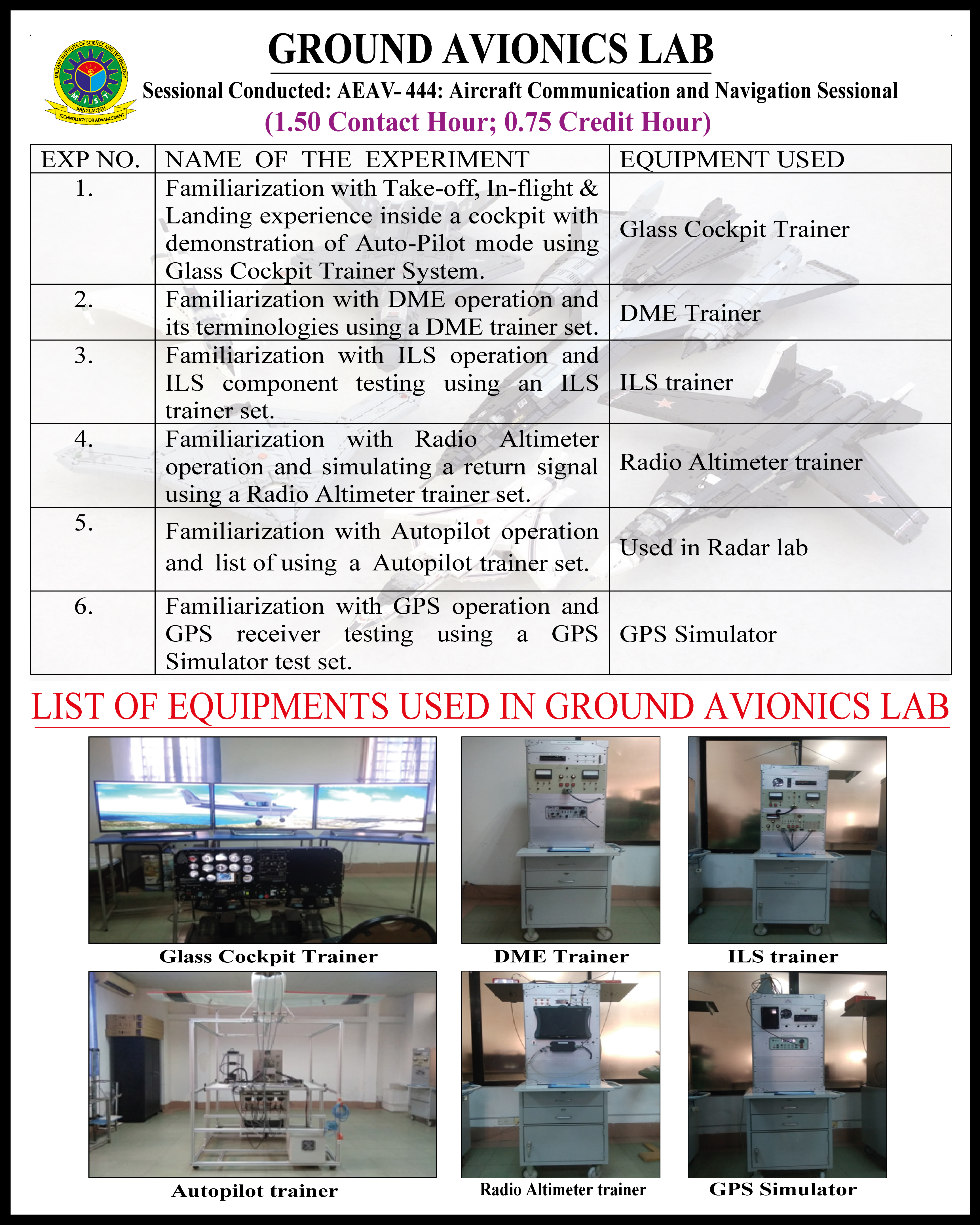 The Avionics, Sensor, and Guidance Lab at the Military Institute of Science and Technology (MIST) stands as a testament to the cutting-edge learning environment MIST offers to its students. Under the stewardship of Lecturer Debanan Bhadra, this state-of-the-art lab integrates both theory and practical learning in the field of avionics, exploring the depths of modern navigation and aircraft guidance systems. The lab is exceptionally equipped with high-tech gear such as an aircraft autopilot system, Instrument Landing System (ILS), Global Positioning System (GPS), Distance Measuring Equipment (DME), Radio Altimeter, and a Glass Cockpit Trainer. These tools offer students an unparalleled opportunity to get hands-on experience with real-world avionics, enabling a deep understanding of the practical applications of theoretical concepts and fostering an environment of learning, innovation, and advancement.