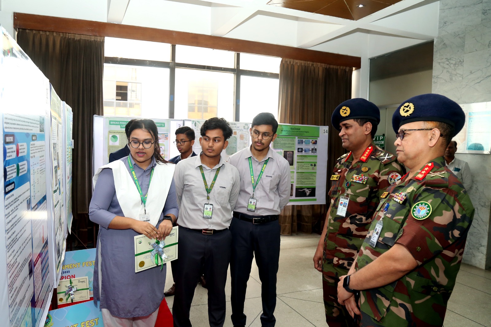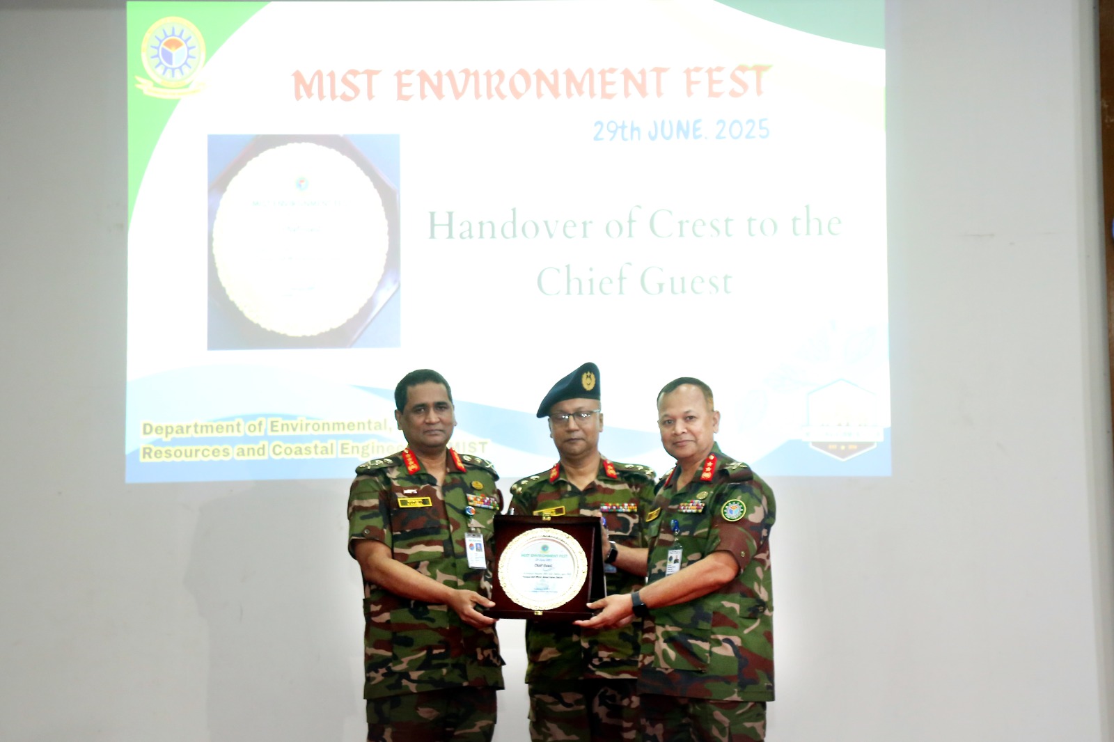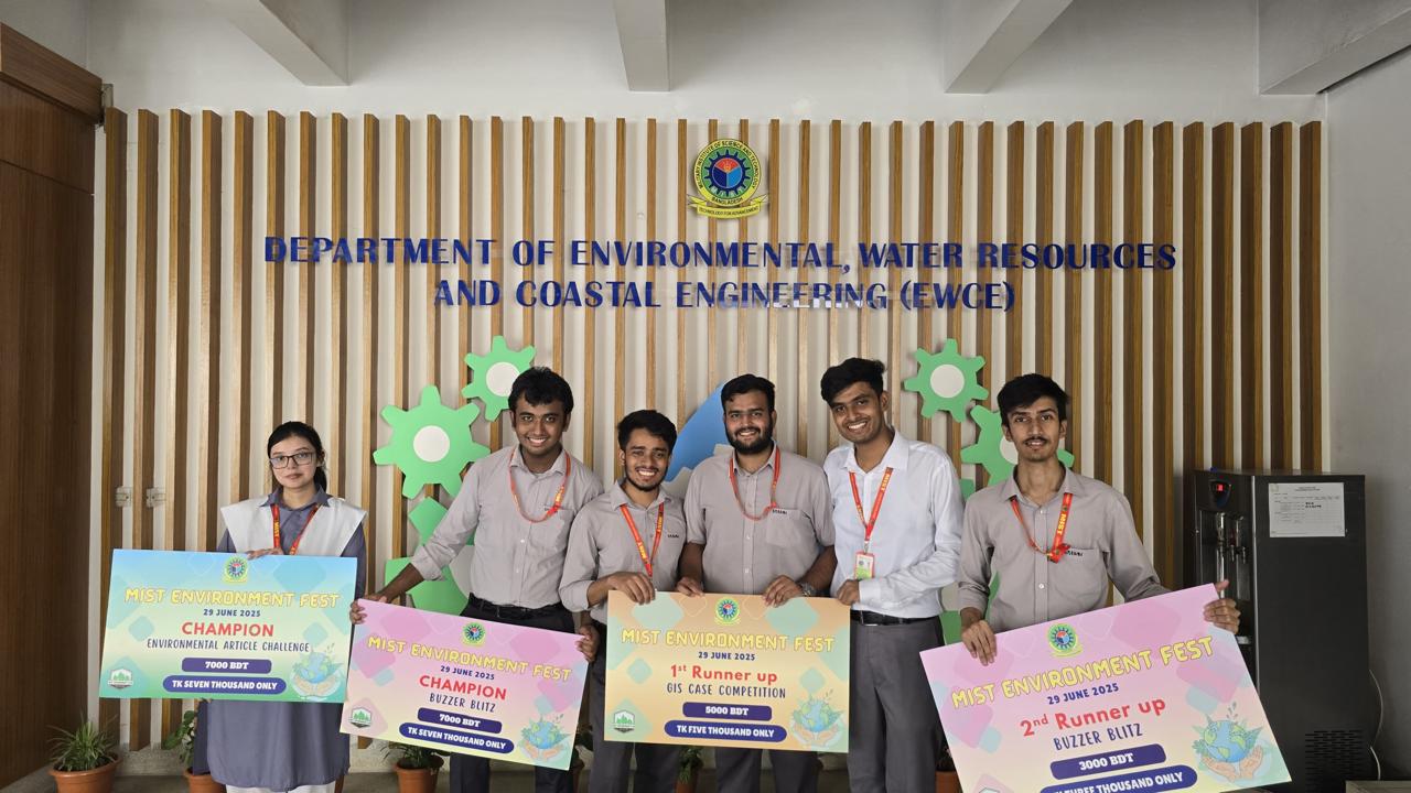 This year, the Department of EWCE, in collaboration with the MIST Environment Club, organized a two-day "MIST ENVIRONMENT FEST 2025" aimed at promoting environmental awareness and sustainable practices under the theme of "Beat Plastic Pollution". The event featured a range of activities, which were held on the 28th of June, including poster presentation, GIS case competition, Buzzer Blitz contest and environmental article writing, all designed to foster a deeper understanding of pressing environmental issues and innovative solutions. This joint effort reflects the department's continued commitment to education, community engagement, and environmental stewardship. On the following day of the event on 29th of June, The Head of the Department extended a warm welcome to everyone from various sectors at MIST Environment Fest 2025. Lt Gen S M Kamrul Hassan, Principal Staff Officer of the Armed Forces Division, attended as the chief guest and expressed the urgency of environmental protection and tackling plastic pollution. A key highlight of the fest was the keynote session, delivered by Dr. Md Mafizur Rahman from BUET, who discussed global efforts to combat plastic pollution. The event also featured technical sessions that addressed some of today’s most critical environmental challenges. Dr. Abdullah Al-Muyeed from the Department of Public Health Engineering (DPHE) shed light on Bangladesh’s sanitation issues, while Nayoka Martinez Bäckström from the Embassy of Sweden emphasized the importance of empowering youth leadership in the face of climate change and environmental uncertainty. In the closing remarks, Maj Gen Md Nasim Parvez, BSP, ndc, afwc, psc, Comdt, MIST, and Chief Patron of the event, highlighted the importance of enhancing public understanding and promoting the adoption of alternatives to plastic to tackle the environmental issues associated with the global climate crisis.