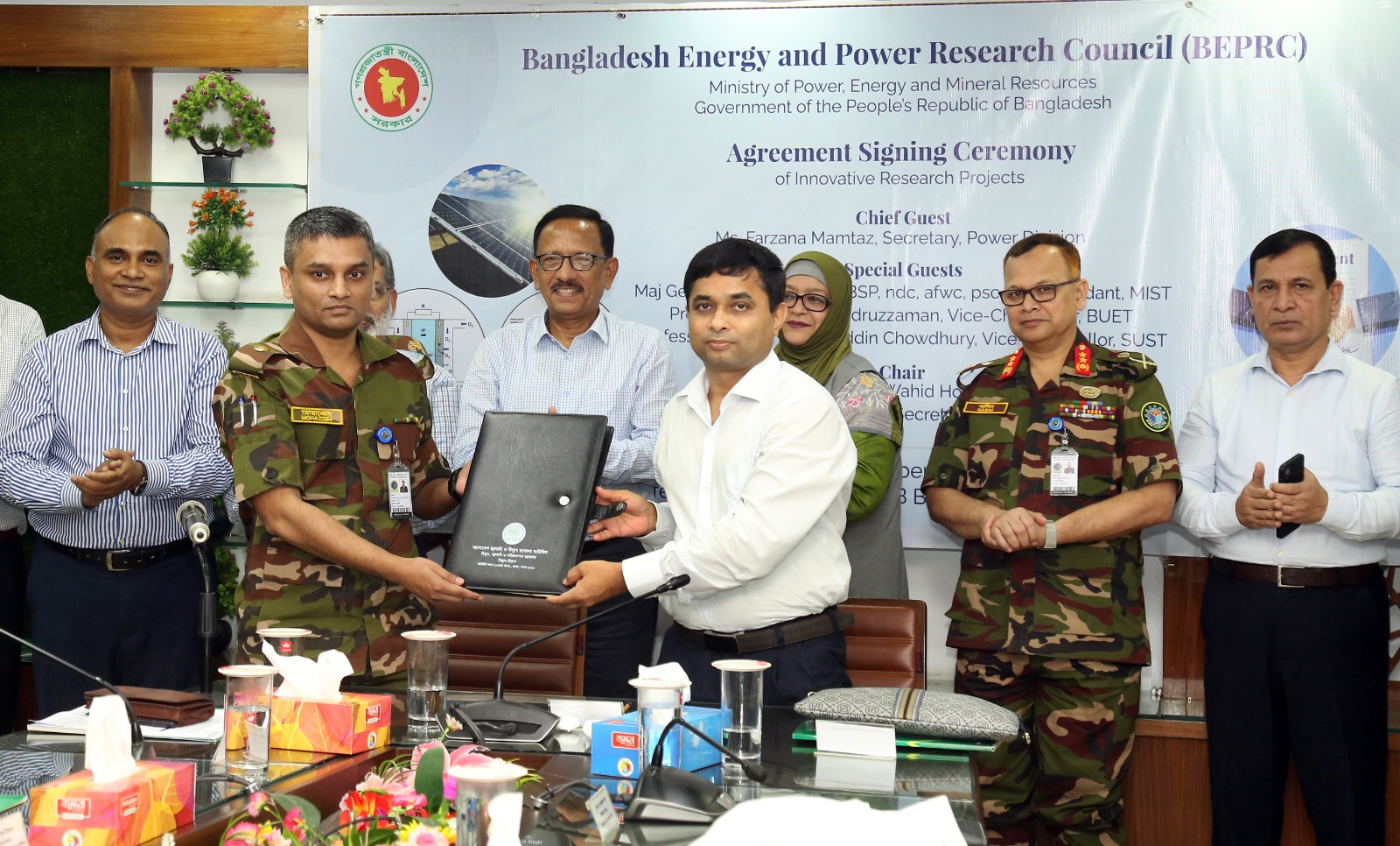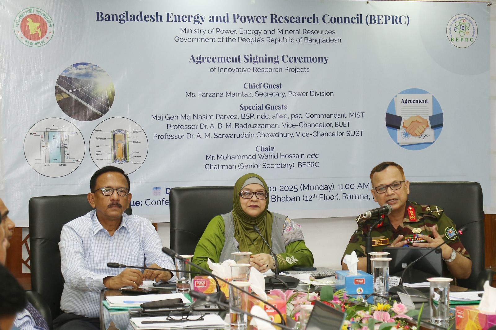 On 29 September 2025, the Bangladesh Energy and Power Research Council (BEPRC) signed a research agreement with the Military Institute of Science and Technology (MIST) for the project titled “Development of an Artificial Intelligence Enabled Digital Twin of a Solar Photovoltaic Plant to Enhance Renewable Penetration in the Power Grid of Bangladesh” with a research budget of BDT 1.63 Crore. The research team includes Maj Moazzem, Maj Naim , Asst Prof Ahsan , and Asst Prof Monir . The signing ceremony was attended by the Senior Secretary (Chairman, BEPRC), Secretary (Power Division), Commandant (MIST), Chairman (PDB), Chairman (SREDA), Members of BEPRC and BERC, and distinguished professors and researchers from BUET and SUST.