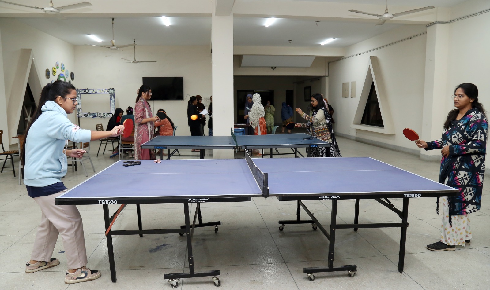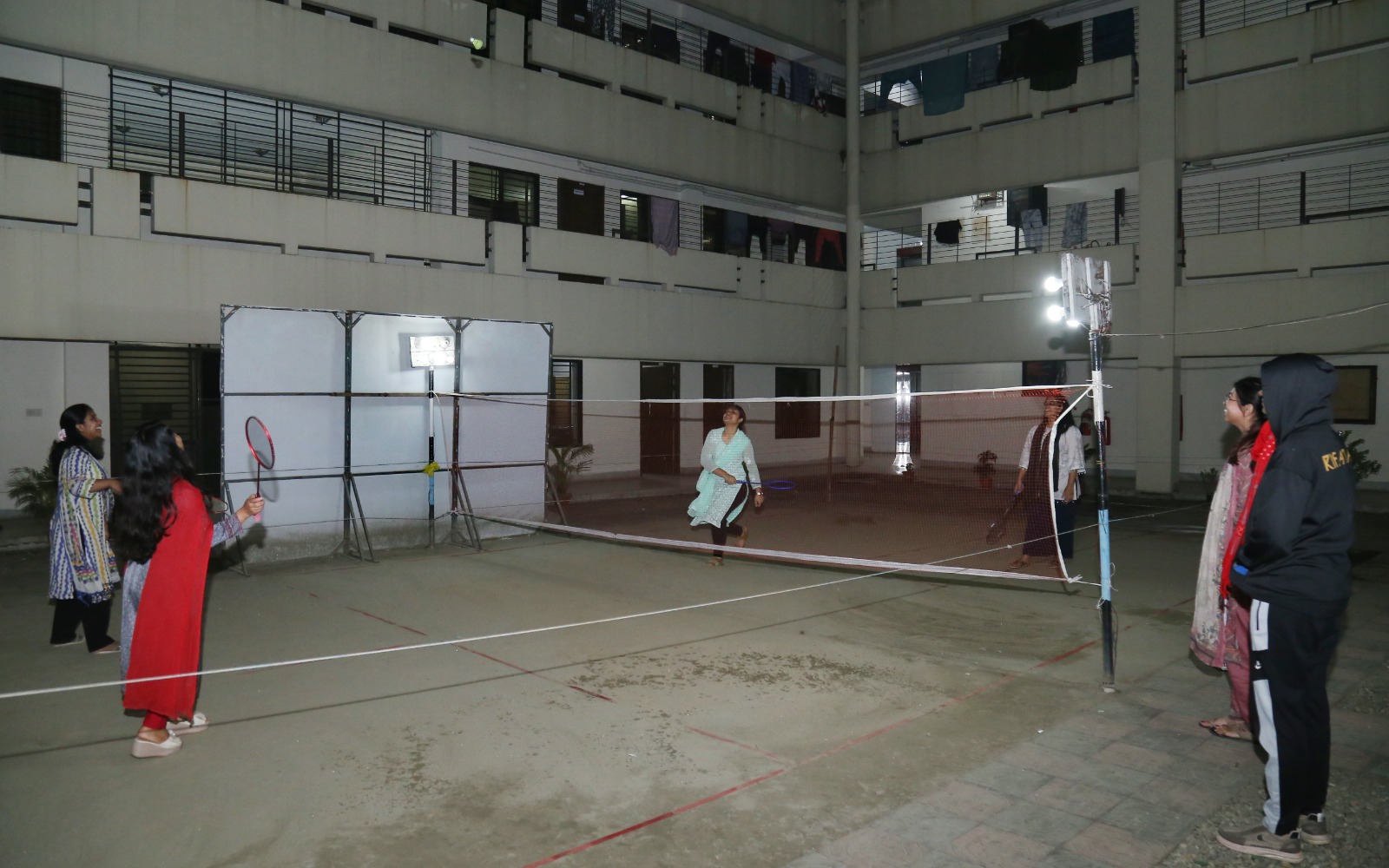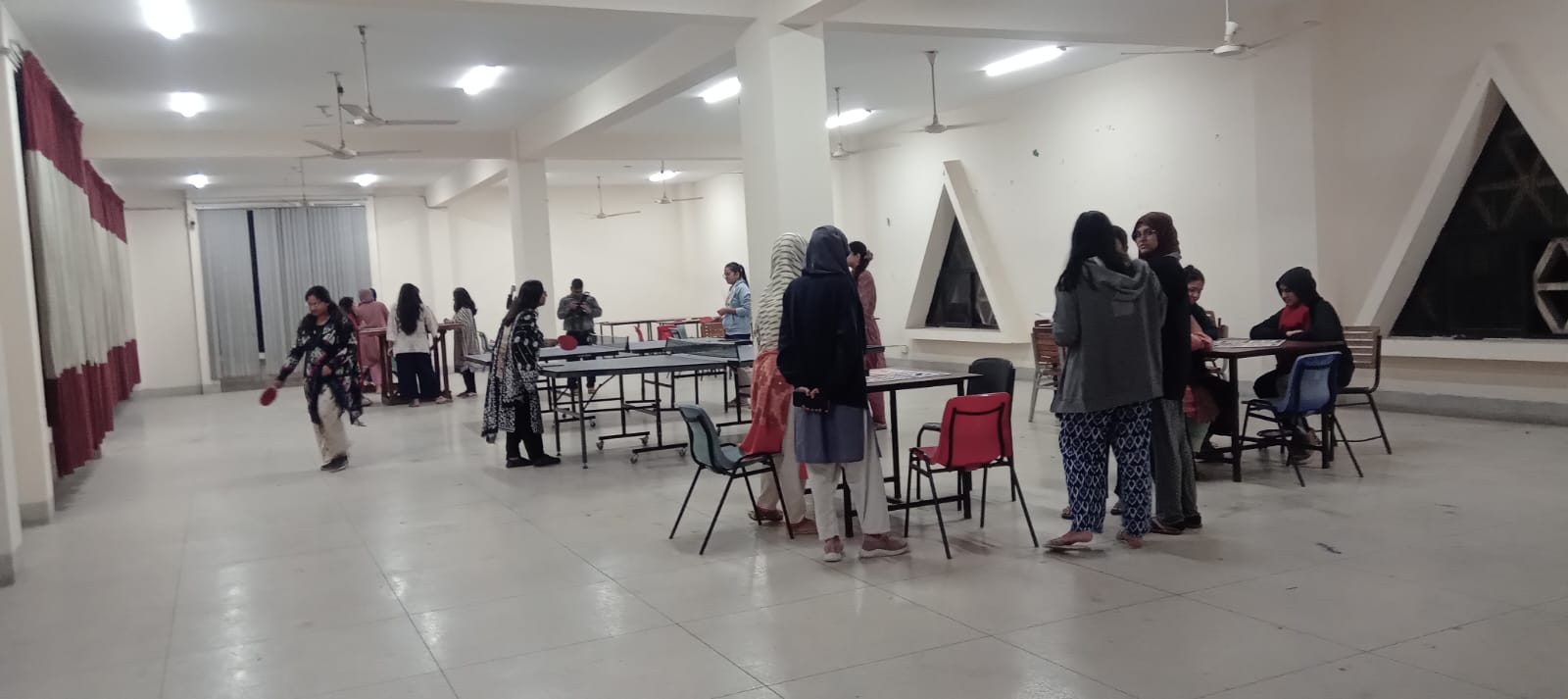 In the female wing, events include Badminton, Table Tennis, Carrom, Ludo, Uno, Baghaduli, and Dart. The male wing is hosting Badminton, Table Tennis, Carrom, Chess, and Dart Throw. All matches are being conducted smoothly with disciplined and fair participation.