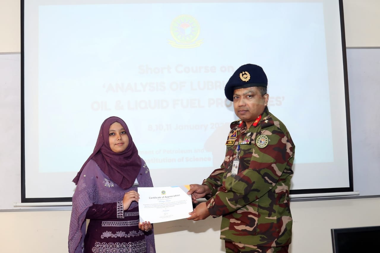 The Department of Petroleum and Mining Engineering has successfully conducted the short course on "Analysis of Lubricating Oil and Liquid Fuel Properties," held from 08–11 January. A total of 29 participants actively took part in the course. The closing ceremony was held on the afternoon of 11 January, during which certificates were awarded by the Head of the Department.