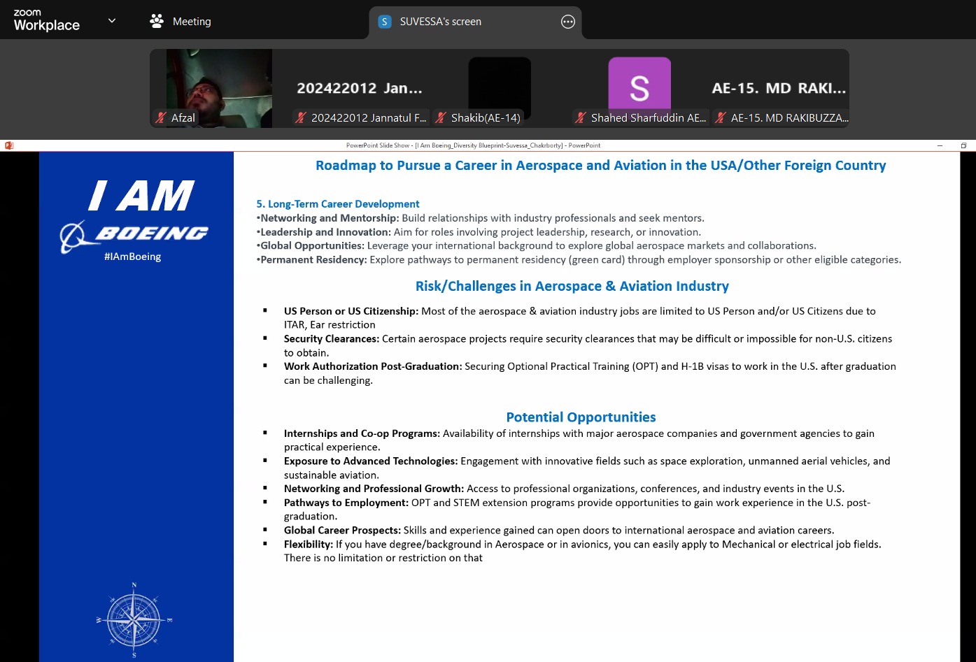 On 27 July 2025, the Department of Aeronautical Engineering, MIST, successfully conducted a webinar titled “Career in Aerospace and Aviation Industries” under the banner of the newly established MIST Student Branch of the American Institute of Aeronautics and Astronautics (AIAA). The session featured two distinguished alumni: Mr. Suvessa Chakraborty, APQP Lead & Senior Supplier Quality Engineer at The Boeing Company (AE-01 Batch), and Dr. Akhter Mahmud Nafi, Astrodynamics Research Scientist at NASA GLIMR Project, University of New Hampshire (AE-02 Batch). Both speakers shared their inspiring journeys from their academic years at MIST to their current positions in the global aerospace industry. Their talks provided invaluable career guidance, industry insights, and motivation to aspiring aerospace professionals. The webinar was attended by 112 enthusiastic students and faculty members, marking a successful initiative by the AIAA MIST Student Branch in fostering global academic and industry engagement.